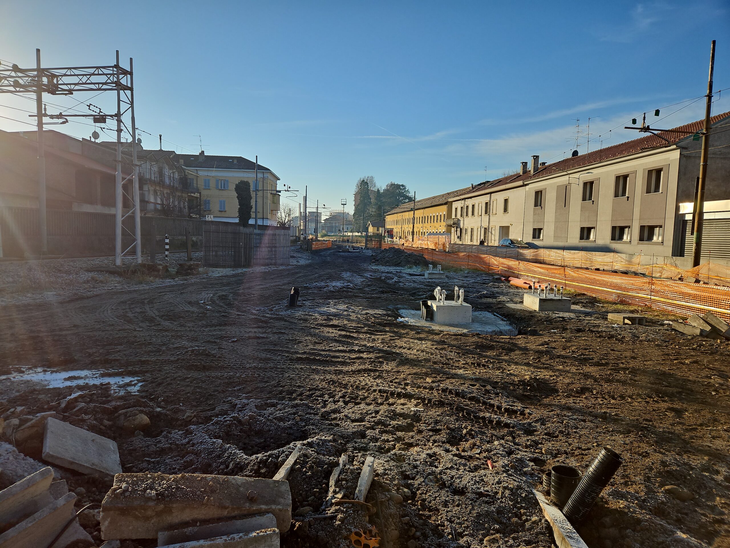 Nelle aree limitrofe a via IV novembre sono iniziati i lavori di adeguamento dei sottoservizi interferenti con il raddoppio. Si tratta di un intervento propedeutico per la realizzazione dell’allargamento della sede ferroviaria e la successiva costruzione dei muri di sostegno. Per realizzare il futuro muro di sostegno tra la via Cesare Battisti e il passaggio a livello di via IV Novembre sono in corso gli scavi della pista di cantiere che permetterà la posa dei micropali.