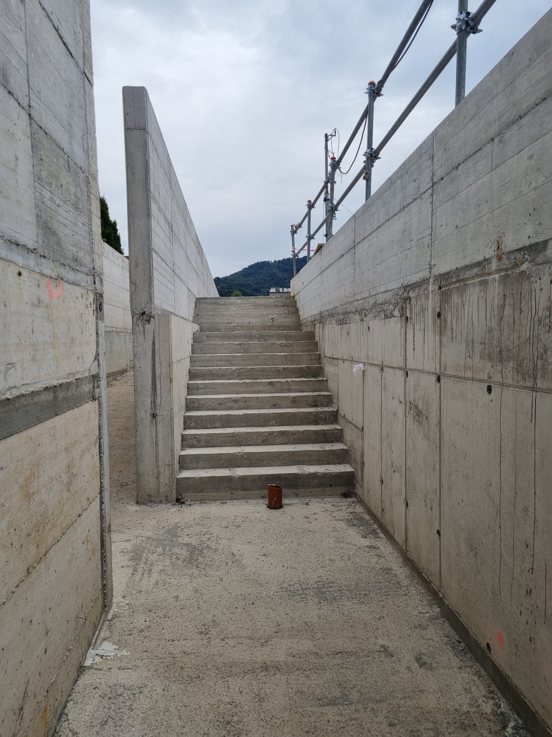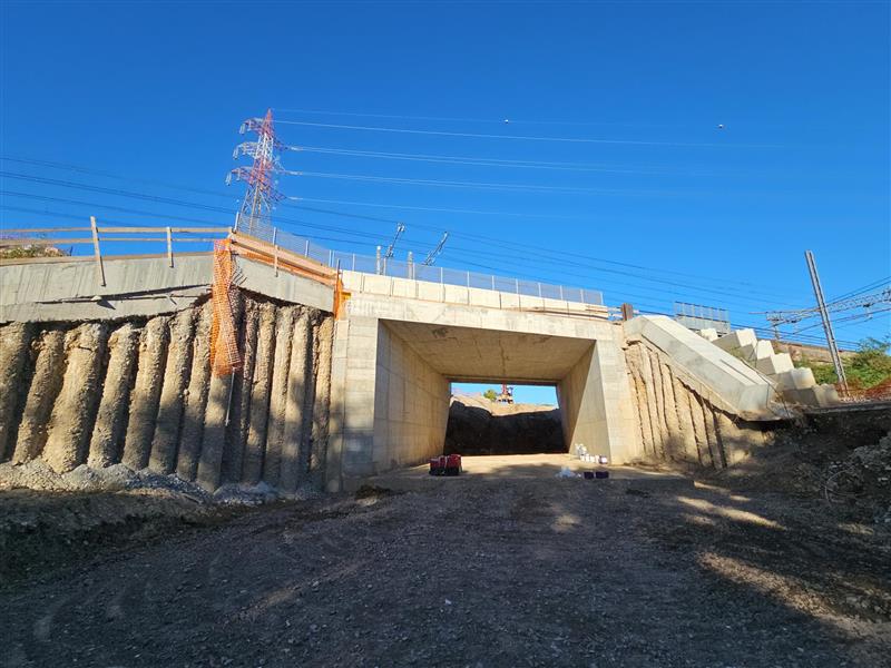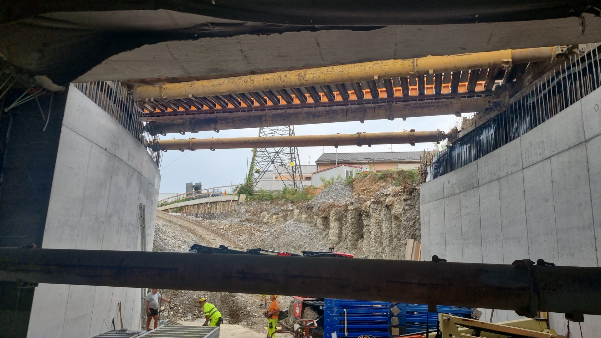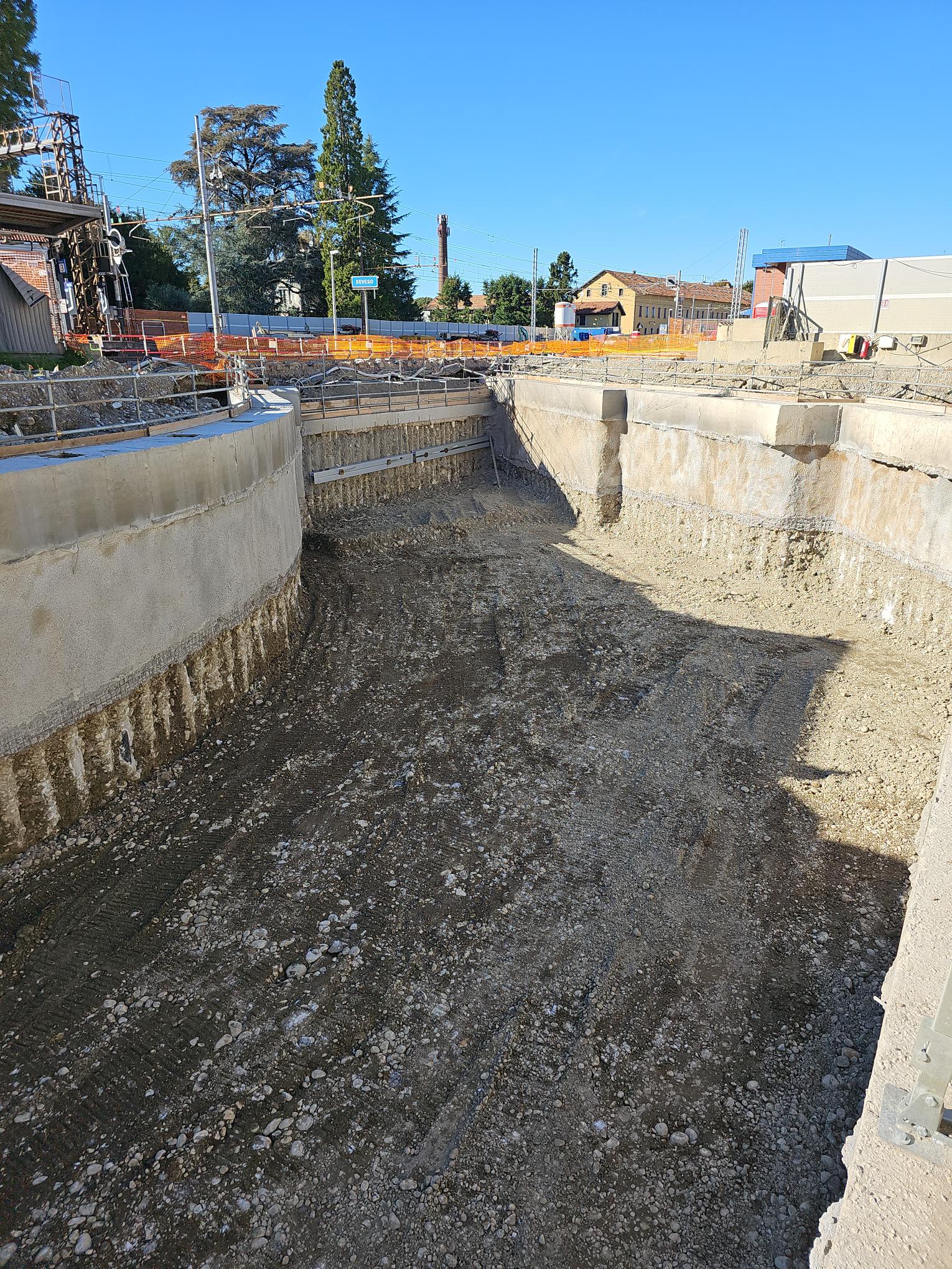 Sono terminati i lavori di realizzazione delle paratie di micropali a sostegno del terreno in corrispondenza della rampa di accesso al binario 1 (posati i tiranti e i puntoni provvisori di contrasto tra le paratie). Sono stati completati gli scavi della rampa di accesso ed è iniziata la costruzione della rampa, a partire dal getto della fondazione in cemento armato.